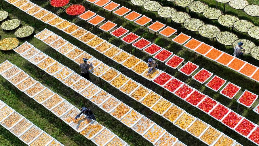 장시(江西)성 이춘(宜春)시 퉁구(銅鼓)현에서 마을 주민들이 수확한 농작물을 가을 햇볕에 말리고 있다. (사진/신화통신)
