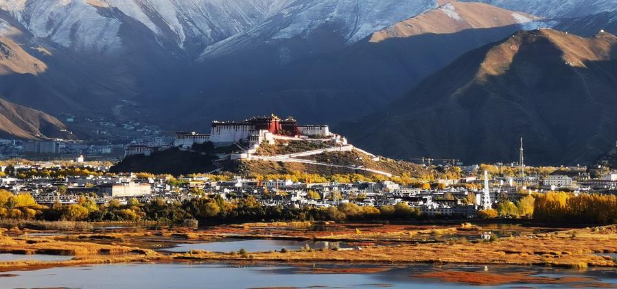 라루(拉魯) 습지에서 바라본 포탈라궁(布達拉宮). 시짱(西藏)자치구 라싸(拉薩)에 위치한 세계문화유산 포탈라궁(布達拉宮)이 가을빛으로 물든 고원과 함께 아름다운 경치를 빚어냈다. (사진/신화통신)가을날,