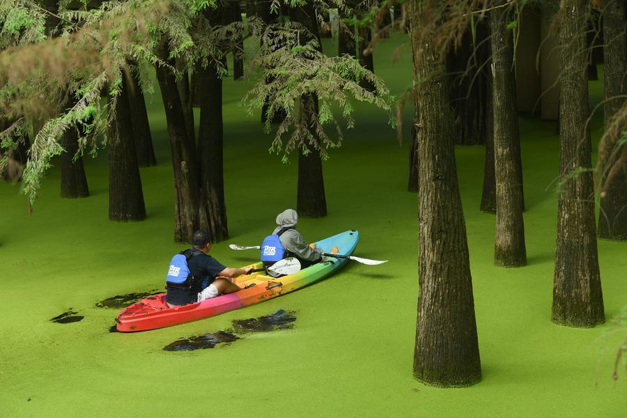 수상삼림에서 뱃놀이를 즐기는 관광객들. 초가을에 접어들자 저장(浙江)성 항저우(杭州)시 칭산후(青山湖) 수상삼림의 수많은 낙우송과 수면 위의 부평초가 어우러져 고즈넉한 자연경관이 연출됐다. (사진/신화통신)
