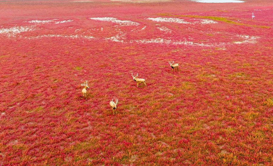 장쑤(江蘇)성 둥타이(東台)시 탸오쯔니(條子泥) 습지에서 사슴들이 노닐고 있다. (사진/신화통신)가을이 숲과 호수, 도시와 산에 스며들면