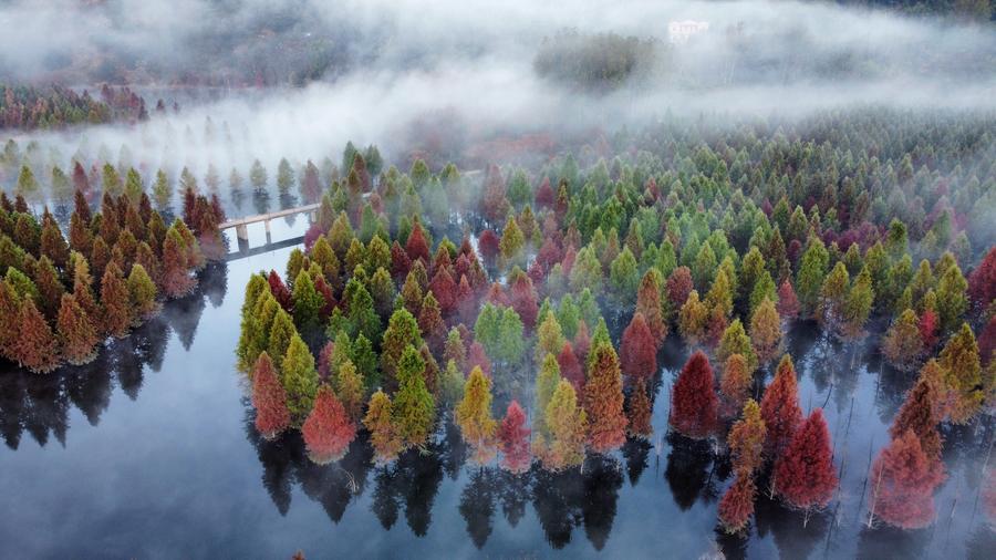 윈난(雲南)성 쿤밍(昆明)시 판룽(盤龍)구에 위치한 수이산(水杉) 습지 내 수이산 숲이 화려한 색을 뽐내며 그림 같은 풍경을 자아낸다. (사진/신화통신)가을의 아름다움은