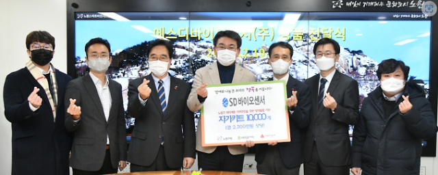 지난 19일 서울 노원구청장실에서 열린 전달식에는 SD바이오센서 박성진 상무, 서준오 서울시의원, 우원식 더불어민주당 국회의원, 오승록 노원구청장, 조금준 고려대구로병원 개방형실험실 구축사업단장, 이민우 운영기획실장 등이 참석했다.