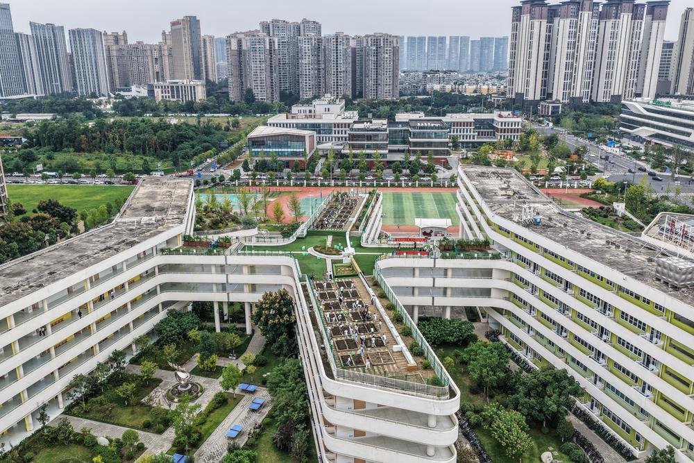 (중국 청두=신화통신) 쓰촨(四川)성 청두(成都)시에 있는 중허(中和)중고등학교 중학교부 안허(安和)캠퍼스는 9월 30일 강의동 옥상의 '하늘 농경지'에서 가을철 채소 파종 행사를 열어 학생과 학부모가 함께 참여하는 시간을 마련했다. 이 학교는 지난 2021년 '하늘 농경지'를 조성했으며 학급마다 '책임 농경지'를 관리하고 있다. 이날 '하늘 농경지'에서 작물을 관리하고 있는 학생과 학부모의 모습을 드론으로 내려다봤다. 2025.9.30