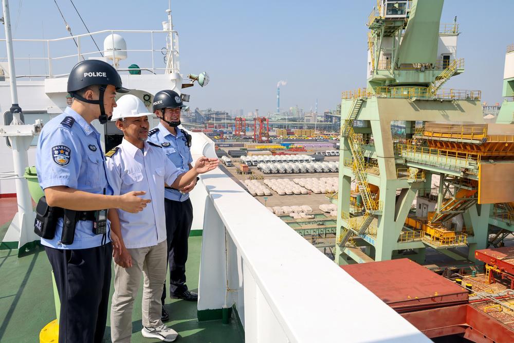 (중국 지난=신화통신) 1일 산둥(山東)항구 르자오(日照)항에서 르자오 출입경변방검사소 민경들이 외항선에 올라 외국인 선장(가운데)과 이야기를 나누고 있다. 중화인민공화국 수립 76주년인 1일 산둥성 르자오 출입경변방검사소의 민경들이 일선에 남아 순찰, 승선 검사 등 업무를 수행하고 있다. 이 덕분에 항구 내 국제 선박의 안전, 통상구 출입경의 원활하고 효율적인 통관이 보장되고 있다. 2025.10.1
