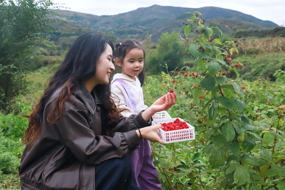 (중국 당창=신화통신) 최근 간쑤(甘肅)성 당창(宕昌)현 난양(南陽)진에 위치한 라즈베리 재배기지가 수확철을 맞았다. 수확한 라즈베리는 선별과 세척 등 여러 과정을 거친 뒤 통조림, 과실주 등 다양한 제품으로 가공돼 시장으로 판매된다. 현지에서는 지난 2019년부터 농민들에게 라즈베리 재배를 적극 유도해 재배·가공·판매·체험 수확을 결합한 산업사슬을 구축해 왔다. 이로써 라즈베리는 마을 주민의 소득 증대와 농촌 진흥을 이끄는 '황금 열매'로 자리 잡았다. 6일 라즈베리를 수확하고 있는 관광객. 2025.10.7
