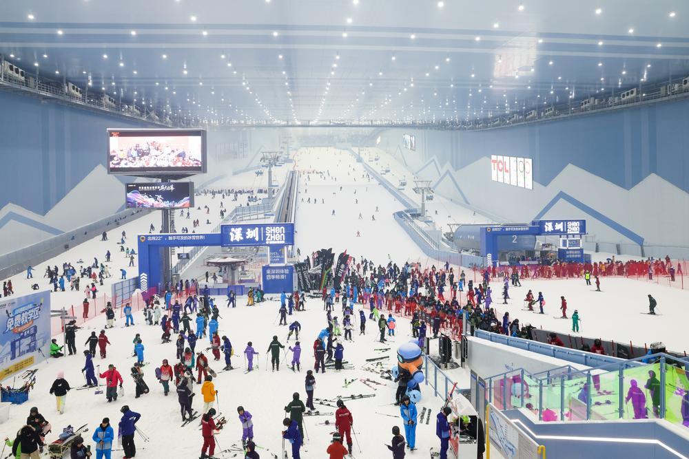 (중국 선전=신화통신) 면적 약 10만㎡에 달하는 선전(深圳)·첸하이(前海) 빙설세계는 5개의 전문 스키 슬로프를 비롯해 다양한 슬로프를 갖추고 있다. 이번 국경절·중추절 연휴 기간 이곳의 관광객 수는 약 20만 명(연인원)에 이를 것으로 예상된다. 웨강아오 대만구(粵港澳大灣區·광둥-홍콩-마카오 경제권) '1시간 빙설 생활권'이 빠르게 구축되고 있다는 평가다. 7일 스키어들로 붐비는 선전·첸하이 빙설세계. 2025.10.7