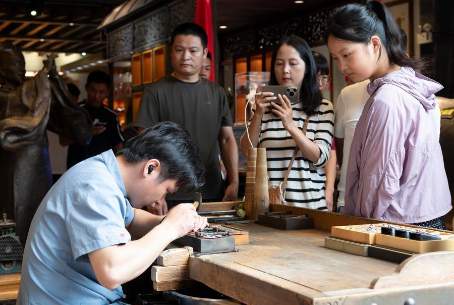 관광객이 6일 푸젠(福建)성 푸저우(福州)시에서 무형문화유산 제작 현장을 지켜보고 있다. (사진/신화통신)