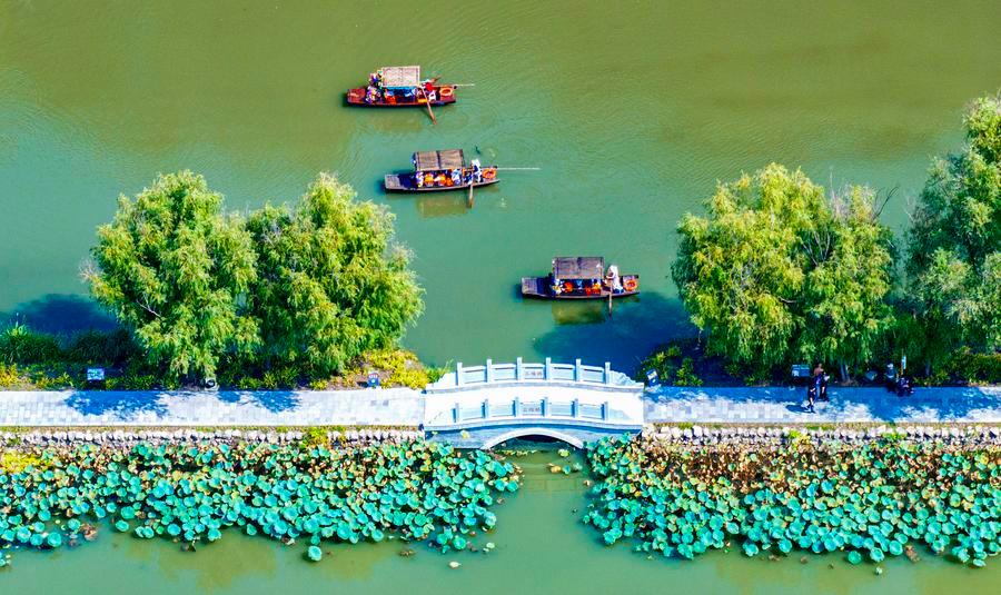7일 장쑤(江蘇)성 싱화(興化)시 리샤허(里下河)국가습지공원에서 뱃놀이를 즐기는 관광객을 드론으로 포착했다. (사진/신화통신)