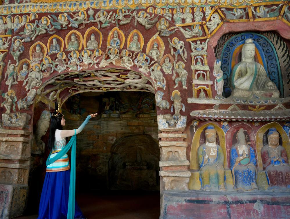 (중국 상하이=신화통신) 9일 상하이에 위치한 진차오8룽(今潮8弄)의 야외 전시구역을 방문한 관람객이 모형 동굴을 배경으로 인증샷을 찍고 있다. 이날 '운강(雲岡)석굴 예술 특별전'이 상하이시 훙커우(虹口)구의 취칸(趣看)미술관에서 개막했다. 운강석굴 문물, 3D로 복원한 모형 동굴, 당대 예술 작품을 감상할 수 있을 뿐만 아니라 가상현실(VR) 인터랙션 체험이 가능한 이번 전시회는 10일 일반 관람을 시작으로 내년 3월 26일까지 이어진다. 2025.10.9