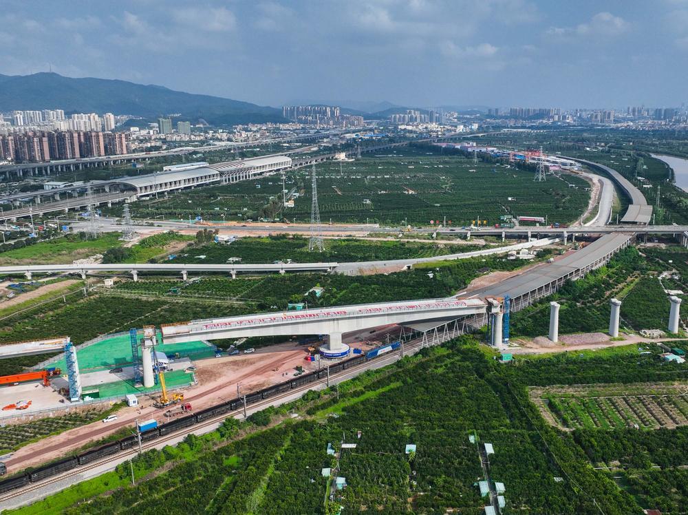 (중국 장먼=신화통신) 10일 선장(深江·선전~장먼)철로 광중장(廣中江·광저우~중산~장먼)특대교 광주(廣珠·광저우~주하이) 화물 운송 철도의 회전교 회전 작업이 성공적으로 완료됐다. 회전교 무게는 1만1천216t(톤), 교량 길이는 160m로 선장철로 핵심 관제 구간에 위치해 있다. 선장철로는 중국 '팔종팔횡(八縱八橫, 중국 주요 도시를 가로·세로 각 8개 노선으로 연결하는 철도 계획)' 고속철도망 중 해안 통로의 주요 구성 부분으로 총 길이가 116km이다. 해당 공사가 완료되면 선전과 장먼(江門) 간 이동 시간을 1시간 내로 단축할 수 있게 된다. 이날 회전 작업을 마친 회전교 아래 화물열차가 지나가는 모습을 드론 사진에 담았다. 2025.10.10