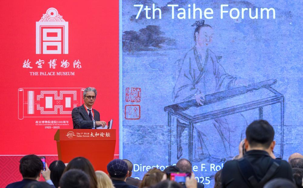 (베이징=신화통신) 고궁(故宫)박물원과 베이징고궁문물보호기금회가 공동 주최한 '제7회 타이허(太和)포럼'이 11일 베이징에서 열렸다. 이번 포럼에서는 ▷세계 박물관의 고품질 운영 및 관리 혁신 ▷세계문화유산지의 녹색 지속가능 발전 ▷박물관의 '문화+테크' 융합 응용 등 세 가지 이슈를 중심으로 토론이 이뤄졌다. 이날 '제7회 타이허포럼' 개막식에서 축사 중인 체이스 로빈슨 미국 스미스소니언 국립아시아예술박물관(NMAA) 관장. 2025.10.11