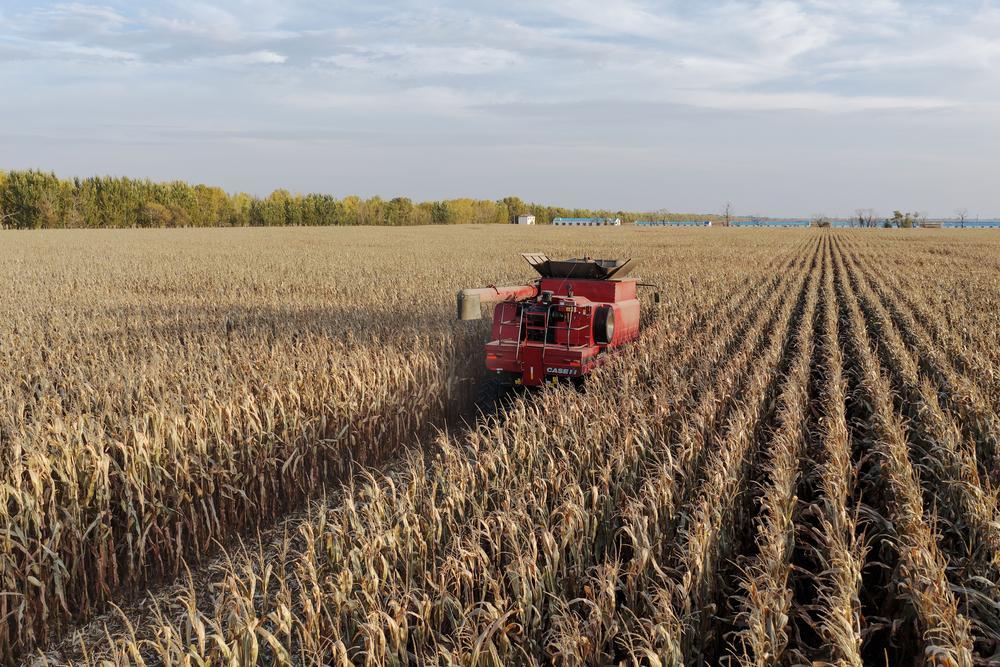(중국 하얼빈=신화통신) 지난 11일 헤이룽장(黑龍江) 자오둥(肇東)시에 위치한 베이다황(北大荒)그룹 산하의 한 농장회사에서 기계로 옥수수를 수확하는 모습을 드론에 담았다. 중국 최대 곡물 생산지인 헤이룽장성은 올 들어 곡물의 단위 면적당 생산량 증대 및 품질 향상에 힘써왔다. 10일 기준 베이다황눙컨(農墾)그룹의 수확 면적은 약 264만6천20㏊로 전체의 84.86%가 완료됐다. 2025.10.12