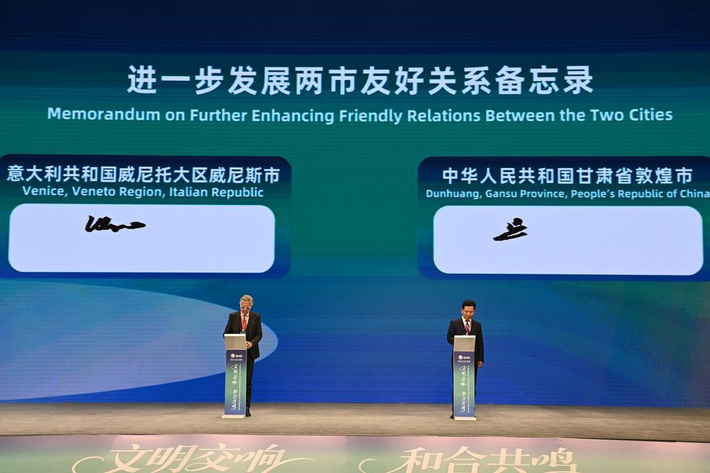 (중국 둔황=신화통신) 13일 열린 '세계 시장(市長) 대화∙둔황(敦煌)' 개막식에서 간쑤(甘肅)성 둔황시와 이탈리아 베네치아시가 두 도시의 우호 관계를 한층 더 발전시키기 위한 양해각서(MOU)를 체결했다. '세계 시장 대화∙둔황'이 이날 둔황시에서 개막했다. 10개 국가에서 온 시장, 주중 사절단, 청년 중국학 학자 등 중국 국내외 귀빈이 포럼에 참석해 문화도시 거버넌스가 직면한 기회와 도전에 대해 함께 논의했다. 2025.10.13