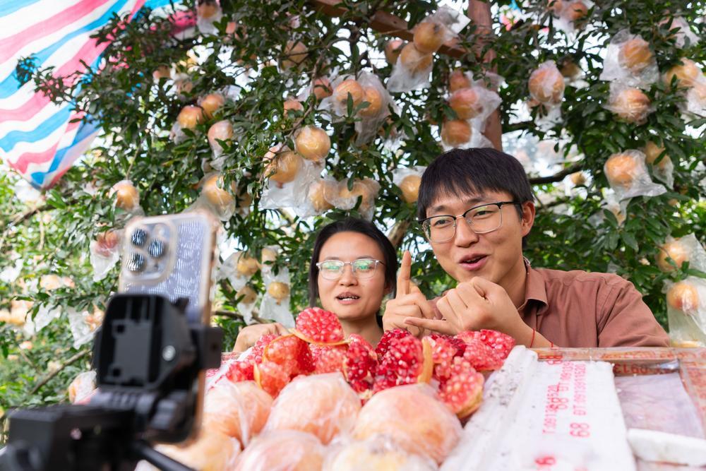 (중국 멍쯔=신화통신) '중국 석류의 고장'이라 불리는 윈난(雲南)성 훙허(紅河)하니(哈尼)족이(彝)족자치주 멍쯔(蒙自)시는 최근 수년간 지속적으로 석류의 정밀 심가공에 주력하면서 농산물 이커머스 등 부대 산업을 발전시켰다. 또한 멍쯔 수출 농산물 종합서비스 센터를 설립해 재배부터 판매를 아우르는 전 산업사슬 순환 체계를 구축했다. 고향에 돌아와 창업에 뛰어든 대학생 우하이타오(吳海濤·오른쪽)가 지난 15일 현지 농민과 함께 라이브방송을 통해 멍쯔 석류를 소개하고 있다. 2025.10.17