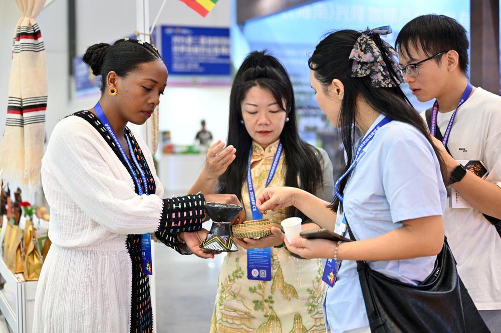 (중국 하이커우=신화통신) '2025 제3회 하이난(海南) 국제 열대 식자재 공급사슬 박람회'가 16~18일 하이난성 하이커우(海口)시에서 열린다. 박람회에는 식품 음료, 코코넛커피·향신료, 수산물·가금류·육류 냉동식품, 식음료 공급사슬 등 전시부스가 마련돼 다수의 중국 국내외 브랜드가 참가했다. 17일 참가업체 직원(왼쪽 첫째, 둘째)이 방문객에게 에티오피아의 커피 원두를 소개하고 있다. 2025.10.17