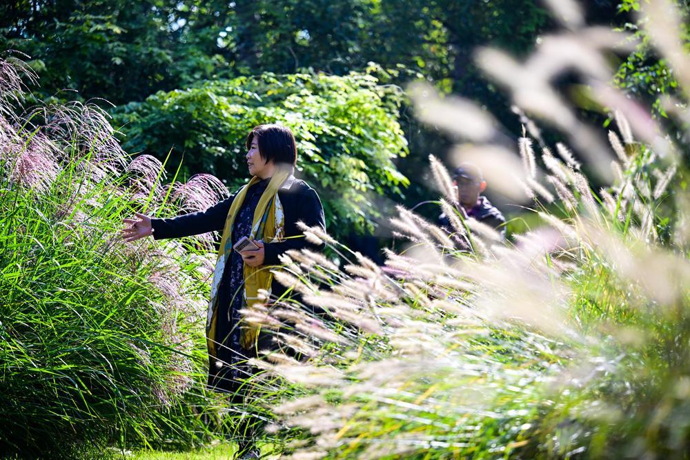 (중국 톈진=신화통신) 20일 톈진(天津)시 빈하이(濱海)신구에 위치한 타이다(泰達)식물자원보존소 첸후이위안(芊卉園)을 구경하는 관광객. 타이다식물자원보존소 첸후이위안이 관상초 관람 절정기를 맞이했다. 약 26만㎡ 면적의 타이다식물자원보존소는 한때 염알칼리토 황무지였다. 그러나 10여 년의 노력 끝에 과학 연구·보급, 시범, 관람을 아우르는 식물 생식질 자원보존소로 탈바꿈했다. 2025.10.20