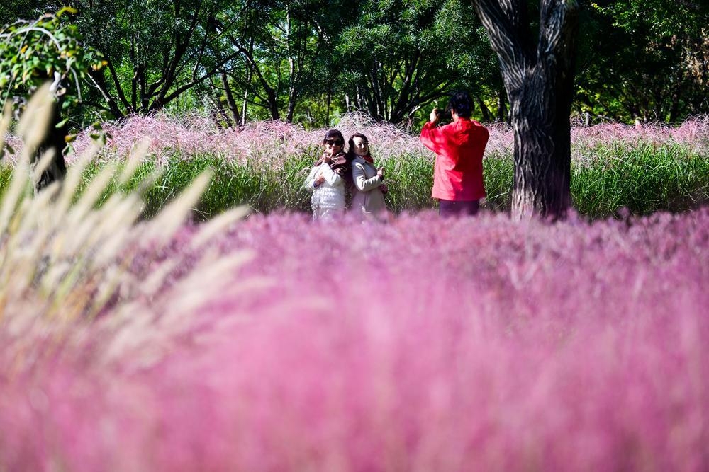 (중국 톈진=신화통신) 톈진(天津)시 빈하이(濱海)신구에 위치한 타이다(泰達)식물자원보존소 첸후이위안(芊卉園)이 관상초 관람 절정기를 맞이했다. 약 26만㎡ 면적의 타이다식물자원보존소는 한때 염알칼리토 황무지였다. 그러나 10여 년의 노력 끝에 과학 연구·보급, 시범, 관람을 아우르는 식물 생식질 자원보존소로 탈바꿈했다. 20일 첸후이위안을 거닐며 사진을 찍는 관광객들. 2025.10.20