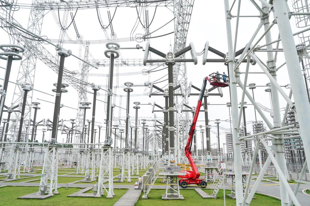 (중국 쉬안청=신화통신) 안후이(安徽) 송변전공정회사 직원이 20일 구취안(古泉) 변전소에서 점검 작업을 하고 있다. 17~23일 준둥(准東)-안후이 남부±1100kV(킬로볼트) 특고압 직류 송전 프로젝트의 수전단 측인 안후이 쉬안청(宣城) 구취안 변전소에서 연례 정비가 한창이다. 해당 기간 900여 명의 전력 정비 인력이 4천525건의 정비 작업을 집중 수행한다. 준둥-안후이 남부±1100kV는 세계에서 전압 등급이 가장 높고 전송 거리가 가장 멀며 전송 용량이 가장 큰 송전 프로젝트다. 2025.10.20