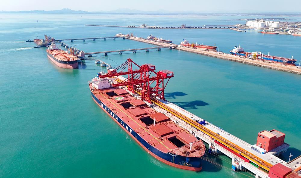 (중국 칭다오=신화통신) 27일 산둥(山東)항구 칭다오(青島)항의 두 번째 40만t(톤)급 광석부두를 드론 사진에 담았다. 이날 산둥항구 칭다오항의 두 번째 40만t급 광석부두가 가동에 들어갔다. 이는 중국 최초의 40만t급 건화물 스마트 디지털 부두로 5G·인공지능(AI)·클라우드 컴퓨팅 등 첨단 기술을 통합했다. 또한 스마트화 건화물 부두 범용 운영체계를 선도적으로 개발·적용해 생산과 경영의 전 과정을 실시간으로 모니터링하고 스마트 의사결정과 디지털 인식을 구현하고 있다. 2025.10.27