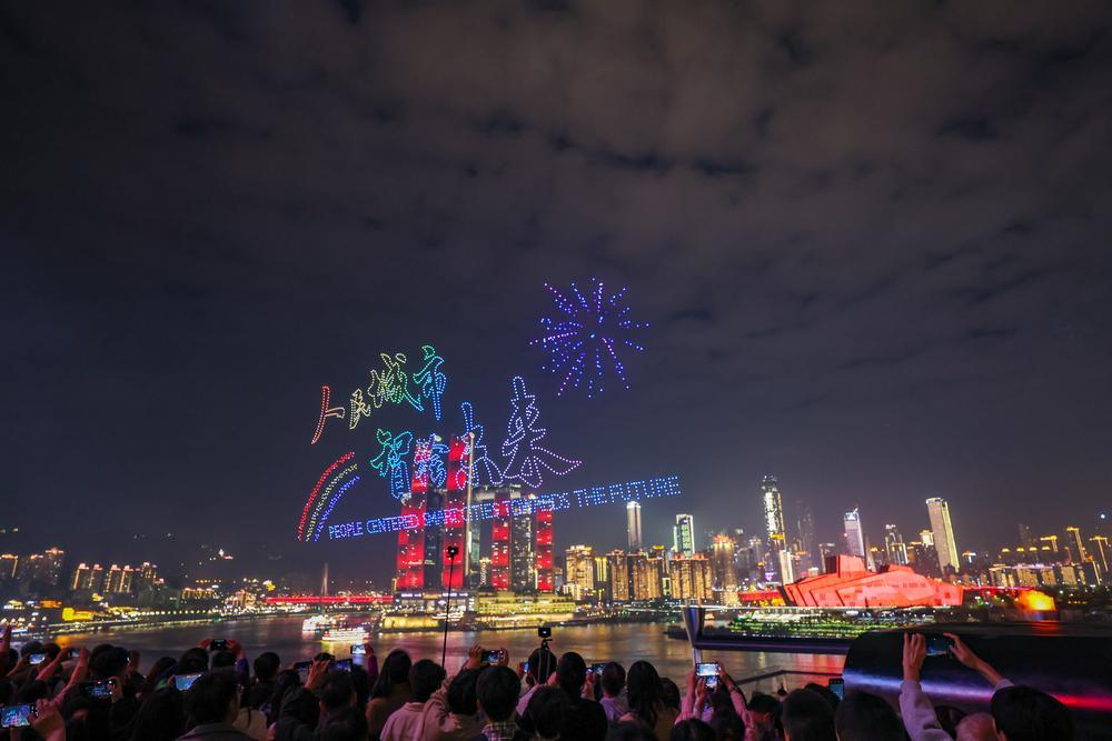 (중국 충칭=신화통신) 27일 저녁 충칭(重慶)시 난안(南岸)구에서 열린 '세계 도시의 날' 특별 드론쇼를 카메라에 담았다. 이날 저녁 수천 대의 드론이 충칭의 밤하늘에 지혜와 온정이 교차하는 도시 풍경을 그려냈다. 2025.10.28