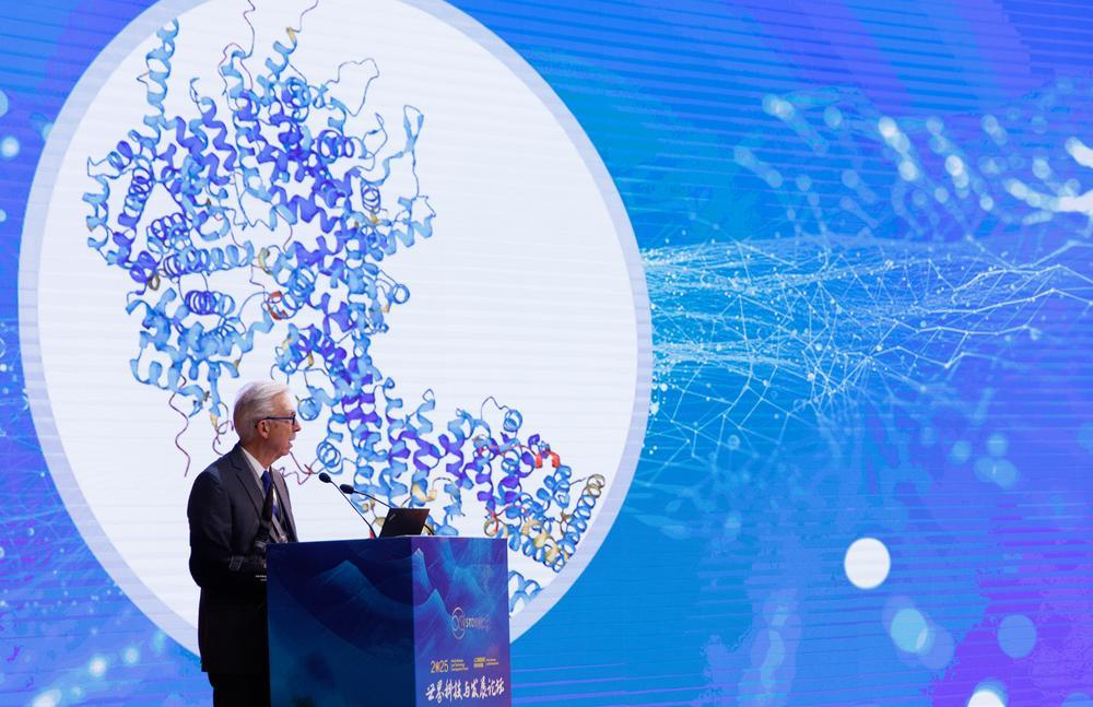 (베이징=신화통신) 27일 베이징에서 열린 '2025 세계 과학기술 및 발전 포럼' 개막식에서 니컬러스 더크스 미국 뉴욕과학아카데미 사장 겸 최고경영자가 기조연설을 하고 있다. 이날 중국과학기술협회 주최로 중국과학기술회당에서 개막한 이번 포럼에서는 인공지능(AI)과 미래 산업, 개방형 과학과 글로벌 협력 등 네 가지 주요 의제를 중심으로 전 세계 과학자와 기업인들이 3일간 교류와 논의를 진행한다. 2025.10.28