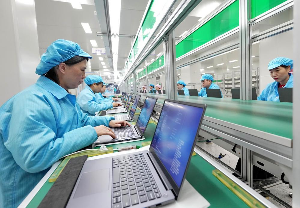 (중국 허베이=신화통신) 31일 허베이(河北)성 스자좡(石家莊) 하이테크산업개발구 전자과학기술단지 광뎬촹신(光電創芯)단지 내 한 생산라인에서 직원이 노트북을 조립하고 있다. 스자좡 하이테크산업개발구 전자과학기술단지의 공공 인프라 연계 건설 프로젝트인 광뎬촹신단지가 이날 문을 열었다. 총 건축면적 16.6만㎡의 이곳은 기술 연구개발 구역과 파일럿 테스트 구역으로 나뉘어 입주기업에 인큐베이팅, R&D, 실험, 테스트 등 서비스를 제공한다. 2025.10.31