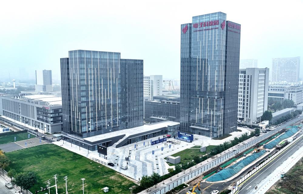 (중국 허베이=신화통신) 허베이(河北)성 스자좡(石家莊) 하이테크산업개발구 전자과학기술단지의 공공 인프라 연계 건설 프로젝트인 광뎬촹신(光電創芯)단지가 31일 문을 열었다. 총 건축면적 16.6만㎡의 이곳은 기술 연구개발 구역과 파일럿 테스트 구역으로 나뉘어 입주기업에 인큐베이팅, R&D, 실험, 테스트 등 서비스를 제공한다. 이날 드론으로 내려다본 스자좡 하이테크산업개발구의 광뎬촹신단지. 2025.10.31