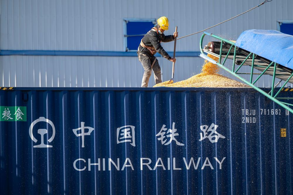 (중국 하얼빈=신화통신) 10월 31일 헤이룽장(黑龍江)성 솽야산(雙鴨山)시의 한 물류단지 전용 철도에서 노동자들이 곡물을 하역하고 있다. 중국 곡물 생산 요충지인 헤이룽장성이 최근 북량남운(北糧南運·중국 북방 지역의 곡물을 남방으로 운송)의 분주한 시기에 접어들었다. 중국철로 하얼빈(哈爾濱)국그룹에 따르면 9월 말부터 현재까지 곡물 운송량은 515만8천t(톤)을 기록했다. 이는 전년 동기 대비 202만7천t 증가한 수치다. 2025.11.1