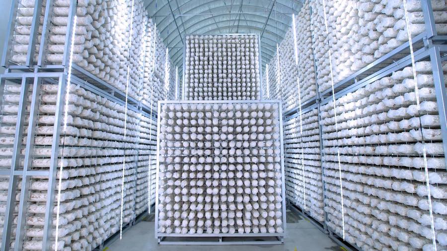 (중국 지난=신화통신) 산둥(山東)성 버섯 기업들이 획기적인 생산 방식을 통해 신선한 버섯을 한국에 수출하고 있다.