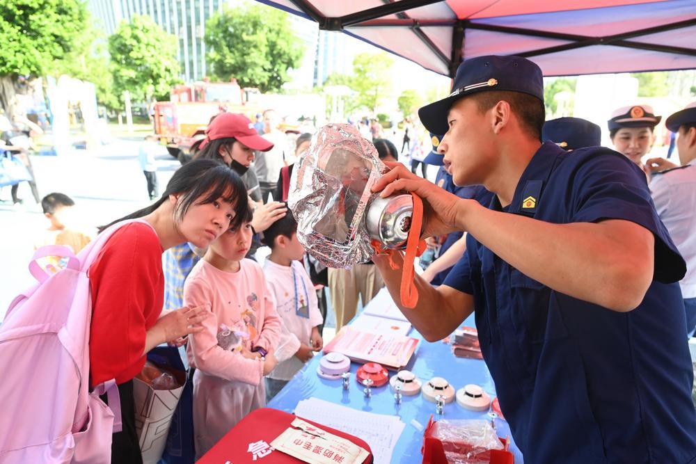 (중국 푸저우=신화통신) 8일 시민에게 가정용 소방장비의 사용법을 설명하는 소방관. 푸젠(福建)성 푸저우(福州)시 소방 홍보의 달 테마 행사 및 제1회 즐거운 소방 운동회가 이날 푸저우 진안후(晉安湖)공원에서 열렸다. 푸저우시 소방 구조대는 흥미로운 경기 형식으로 소방 안전 지식을 홍보했다. 이에 가족 단위로 구성된 119개 팀과 1천 명의 시민들이 경기에 적극 참여했다. 2025.11.8