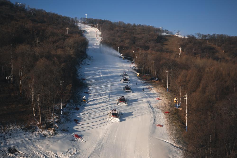 (중국 지린시=신화통신) 14일 지린(吉林)성 지린시 빙설경제고품질발전시험구에 위치한 베이다후(北大湖)스키리조트에서 작업 중인 압설기의 모습을 드론으로 담았다. 절기상 입동(立冬)이 지난 후 기온이 계속 내려가자 지린성 내 여러 스키장들이 개장 준비로 분주하다. '빙설 황금 위도대(緯度帶)'에 위치해 있는 지린성은 눈 내리는 기간이 길고 온도가 적당해 중국의 유명 스키 명소로 자리 잡았다. 2025.11.14