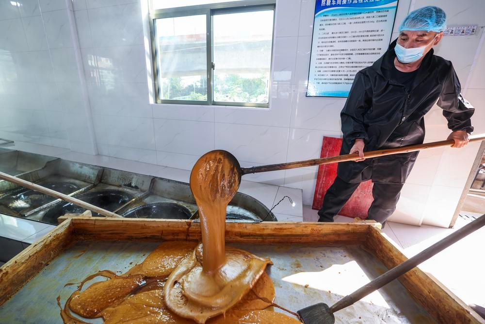 (중국 이우=신화통신) 15일 직원이 저장(浙江)성 이우(義烏)시 밍웨(銘悅)흑설탕공장에서 전통 방식으로 흑설탕을 만들고 있다. 초겨울이 되자 이우시 농촌지역에서는 흑설탕 생산 성수기를 맞았다. '흑설탕의 고장'으로 불리는 이우는 장작과 가마솥으로 설탕을 달이는 전통 방식을 고수하고 있다. 이곳에서 만들어진 흑설탕은 빛깔이 연하고 푸른색을 띠어 일명 '이우칭(義烏青)'으로 불린다. 2025.11.15