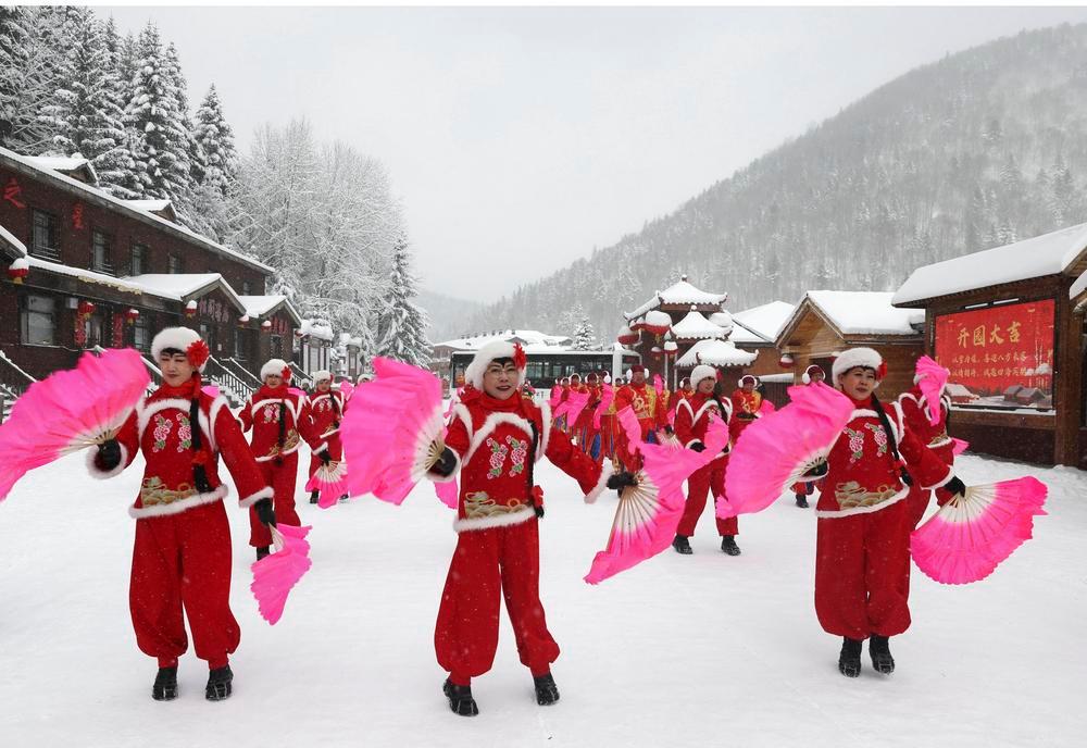 (중국 무단장=신화통신) 헤이룽장(黑龍江)성 무단장(牡丹江)시에 위치한 '중국 설향(雪鄕)' 관광지가 17일 정식으로 개방됐다. 올겨울 이곳 관광지는 전통 민속, 현대 공연, 과학기술 조명 등 30여 개의 다양한 특색 문화관광 활동을 선보이며 관광객들에게 몰입형 빙설 체험을 제공할 예정이다. 이날 '중국 설향' 관광지의 한 거리에서 양거(秧歌·중국 북방 농촌 지역의 민간 가무)를 선보이는 공연팀. 2025.11.17