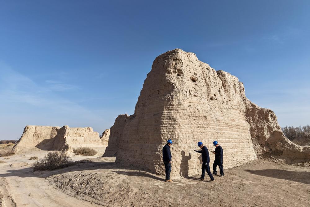 (중국 과저우=신화통신) 18일 서쪽벽 마면(馬面)의 보강 상태를 살피는 둔황(敦煌)연구원 문물보호기술서비스센터 직원을 드론 사진에 담았다. 최근 전국중점문물보호단위인 포청쯔(破城子) 유적 보수 공정(2기)이 정식으로 마무리돼 자료 정리 및 검수 준비 단계에 들어갔다. 간쑤(甘肅)성 과저우(瓜州)현에 위치한 포청쯔는 한나라·당나라 시기 실크로드의 중요 고성 유적이다. 2025.11.18