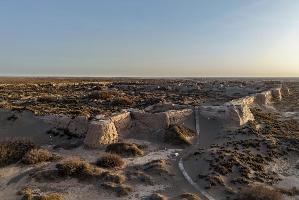 (중국 과저우=신화통신) 18일 간쑤(甘肅)성 과저우(瓜州)현의 쒀양청(鎖陽城) 유적을 드론으로 내려다봤다. 과저우현 쒀양청진의 동남쪽 고비사막에 위치한 쒀양청 유적은 실크로드의 중요 변방 요충지이자 교통 허브로 통한다. 성터, 사찰, 농업 관개 수로, 묘지군으로 이루어진 이곳은 지난 2014년 '실크로드: 창안(長安)-톈산(天山) 회랑 도로망' 유산 중 하나로 세계문화유산 목록에 등재됐다. 2025.11.19