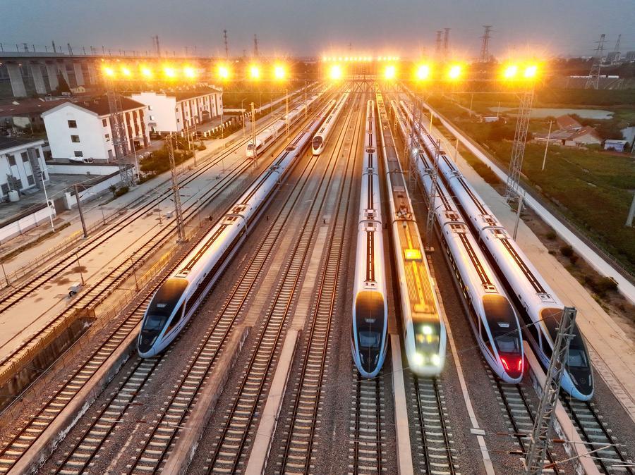 (중국 다롄=신화통신) EMU(동력분산식·Electric Multiple Unit) 열차 및 전력 기관차가 18일 랴오닝(遼寧)성 다롄(大連)시에 위치한 중국중처(中國中車·CRRC) 다롄전기기관차차량회사 생산 라인에서 출고됐다. 여객용 EMU 열차와 화물용 전력 기관차는 말레이시아 동해안 노선에 투입될 예정이다.
