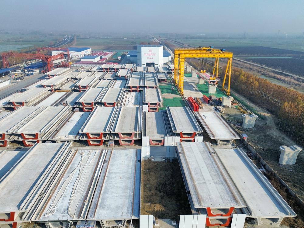 (중국 린이=신화통신) 중국 국가 중점 프로젝트인 웨이쑤(濰宿)고속철도 9구간에 위치한 란차오(嵐曹) 고속도로 횡단 특대교의 첫 번째 박스빔이 21일 성공적으로 설치됐다. 웨이쑤고속철도의 총길이는 약 399㎞, 설계 시속은 350㎞다. 이날 산둥(山東)성 웨이팡(濰坊)시와 장쑤(江蘇)성 쑤첸(宿遷)시를 연결하는 웨이쑤고속철도 9구간 란차오 고속도로 횡단 특대교의 첫 번째 박스빔 설치 공사 현장을 드론으로 내려다봤다. 2025.11.21
