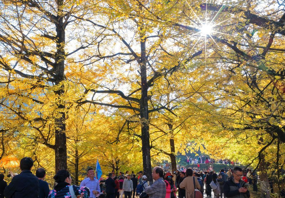 (중국 융저우=신화통신) 최근 후난(湖南)성 융저우(永州)시 솽파이(雙牌)현의 은행나무 3천여 그루가 황금색으로 물들며 수많은 관광객을 끌어들이고 있다. 솽파이현은 최근 수년간 '은행(銀杏) 경제'를 적극 추진하는 등 특색 있는 관광 프로젝트를 발전시켜 지역 주민들의 소득 증대를 이끌고 있다. 관광객들이 23일 솽파이현 퉁쯔아오(桐子坳)촌에서 노랗게 물든 은행나무를 감상하고 있다. 2025.11.24