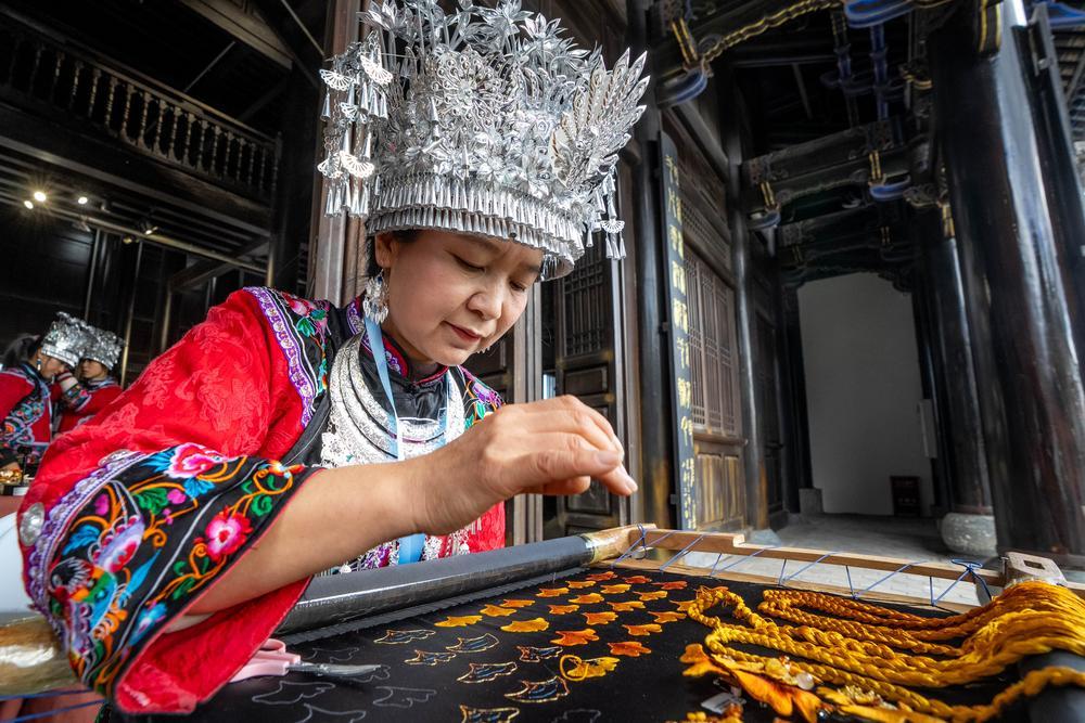 (중국 다리=신화통신) 23일 '2025 무형문화유산 브랜드 홍보 주간' 행사에서 충칭(重慶)시 유저우(酉州)의 묘족 자수 시(市)급 전승자가 자수를 놓고 있다. '2025 무형문화유산 브랜드 홍보 주간' 출범식이 이날 윈난(雲南)성 다리(大理)시에서 열렸다. 이번 홍보 주간에는 높은 인지도와 영향력을 자랑하는 전국 각지의 특색 무형문화유산 브랜드 120여 개가 집중 전시된다. 2025.11.23