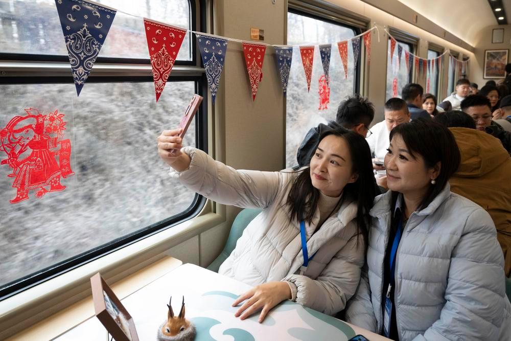 (중국 하얼빈=신화통신) 26일 올겨울 첫 빙설 관광 열차인 Y783편 열차에 탑승한 관광객이 기념촬영을 하고 있다. 이날 300여 명의 관광객이 헤이룽장(黑龍江)성 하얼빈(哈爾濱)역에서 Y783편 관광 열차에 올라 6일간의 일정으로 '북부 지역 여행'을 시작했다. 열차 내부에는 테마 장식과 문화 해설, 다양한 체험 활동이 마련돼 북방의 풍경과 문화를 생생하게 보여준다. 이동형 문화 랜드마크를 지향하는 이 열차는 겨울철 관광 활성화와 빙설 경제에 새로운 활력을 불어넣을 것으로 기대된다. 2025.11.26