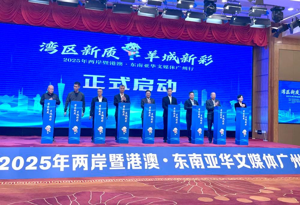 (중국 광저우=신화통신) '2025년 양안(兩岸) 및 홍콩·마카오-동남아 중국어 미디어 광저우(廣州) 투어' 행사가 2일 광둥(廣東)성 광저우에서 열렸다. 현장에서는 해협 양안, 홍콩·마카오 지역, 동남아에서 온 50여 명의 중국어 언론인들이 공동 취재단을 구성했다. 이들은 '만구(灣區·베이 에어리어)의 신질 생산력, 광저우의 새로운 색채'를 주제로 3일 동안 심층 탐방을 진행한다. 이날 광저우에서 열린 '2025년 양안 및 홍콩·마카오-동남아 중국어 미디어 광저우 투어' 행사 출범식 현장. 2025.12.3