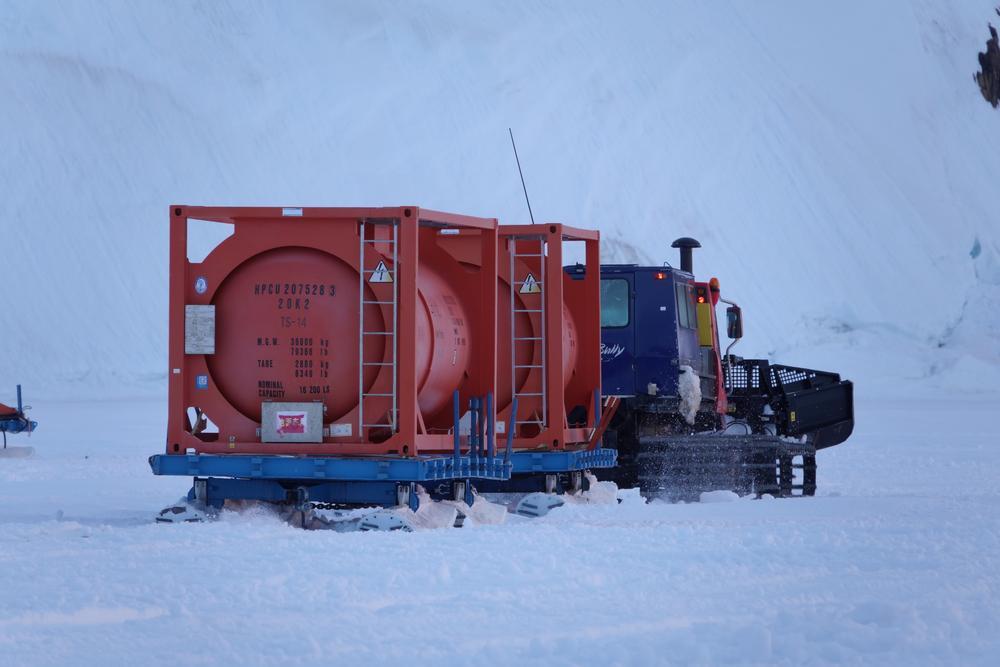 (중국 쉐룽2호=신화통신) 중국 제42차 남극 탐사 임무를 수행 중인 중국 극지 과학탐사선 '쉐룽(雪龍)호'가 남극 중산(中山)기지 빙붕에 도착했다. '쉐룽 2호'는 베이징 시간으로 지난달 25일 먼저 이 지역에 도착했다. 두 선박은 약 15일간 2천t(톤)가량의 각종 물자를 내릴 예정이다. 3일 새벽, 설상차가 연료를 가득 채운 유조 탱크를 싣고 '쉐룽 2호'를 떠나 중산기지로 향하고 있다. 2025.12.3