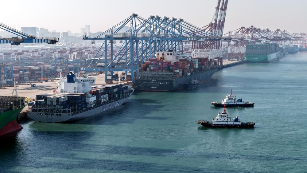 (중국 칭다오=신화통신) 최근 며칠간 산둥(山東) 칭다오(青島)항에 대형 선박들이 잇따라 정박하며 분주한 풍경을 연출했다. 올 들어 칭다오항은 중국 북부의 중요한 대외무역 관문으로서 긴밀하고 원활한 운송 시스템을 구축했다. 칭다오항의 전체 대외무역 항로는 약 240개에 달하며, 세계 180개 이상 국가(지역)의 700여 개 항구와 연결돼 있다. 4일 칭다오항 첸완(前灣) 항구구역 부두에서 컨테이너를 하역하는 화물선을 드론으로 내려다봤다. 2025.12.4