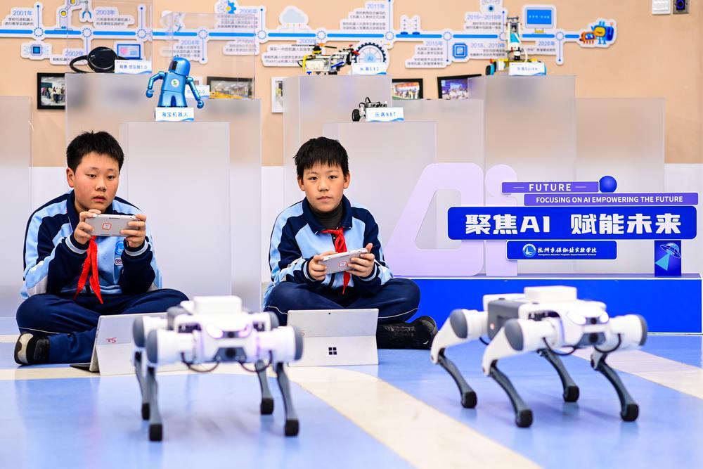 (중국 항저우=신화통신) 지난 2일 저장(浙江)성 항저우(杭州)시 바오추타(保俶塔)실험학교 학생들이 로봇개 프로그래밍을 학습하고 있다. 항저우시는 올해 가을 학기부터 초·중·고교 전 학년에서 인공지능(AI) 교양 교육을 시작했다. 항저우시의 많은 학교에서는 AI 주제 수업을 진행하고 AI 실습 기회를 제공하는 등 다양한 형태로 캠퍼스 내 AI 교양 교육을 적극 추진하고 있다. 2025.12.5