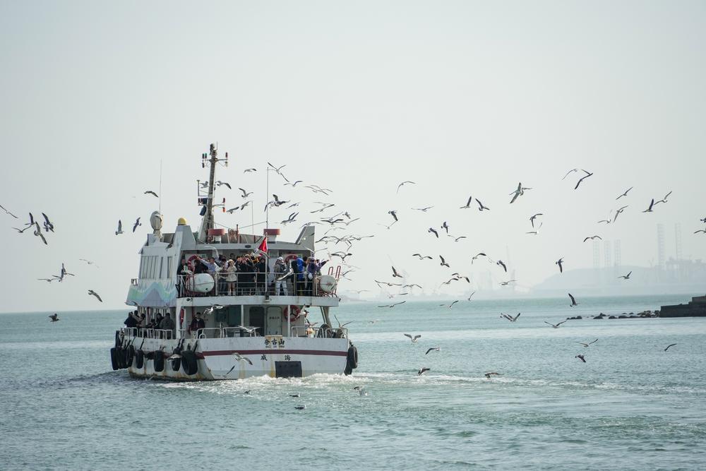 (중국 지난=신화통신) 중국 최초의 연해 개방 도시인 산둥(山東)성 웨이하이(威海)는 최근 수년간 동북아 허브라는 지리적 위치와 천혜의 우수한 심수항을 기반으로 중∙한 자유무역구 지방경제 협력 시범구를 적극 건설할 뿐만 아니라 비즈니스 환경을 꾸준히 최적화해 갈수록 많은 기업가가 찾고 투자하는 도시로 발전하고 있다. 지난 10일 웨이하이시에서 해상 유람선을 타고 이동하는 관광객. 2025.12.12