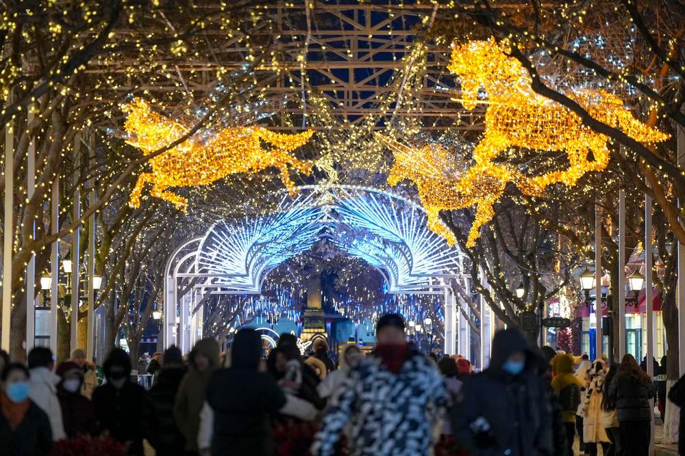 (중국 하얼빈=신화통신) 12월 들어 헤이룽장(黑龍江)성 하얼빈(哈爾濱)시가 겨울 관광 성수기에 접어들면서 중양다제(中央大街)에 인파가 끊이지 않고 있다. 하얼빈시의 대표 거리인 중양다제는 다채로운 창의적 경관과 조명 장식이 어우러져 한층 더 매력적인 풍경을 연출하고 있다. 밤이 되고 불빛이 켜지면 관광객들은 이곳만의 독특한 문화적 매력을 만끽한다. 16일 하얼빈 중양다제에 설치된 조명 장식. 2025.12.16