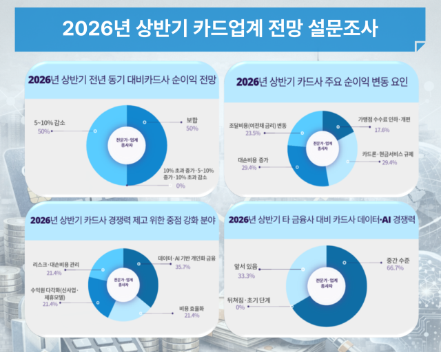 29일 이코노믹데일리가 국내 카드업계 전문가·카드사를 대상으로 실시한 '2026년 상반기 카드업계 전망' 설문 조사에 따르면 국내 카드업계 관계자 대다수는 내년 상반기 카드사 순익이 전년 동기 대비 감소하거나 비슷한 수준을 유지할 것이라고 응답했다.