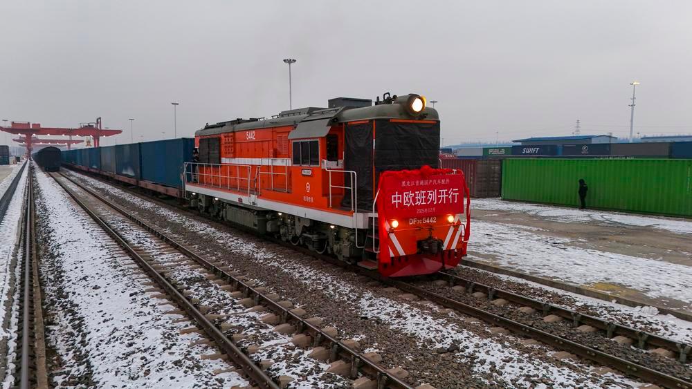(중국 하얼빈=신화통신) 중국철로 하얼빈(哈爾濱)국그룹의 올해 첫 중국산 자동차 부품 중국-유럽 화물열차가 18일 하얼빈국제컨테이너센터역에서 출발했다. 55개의 컨테이너를 실은 화물열차는 네이멍구(內蒙古)자치구 만저우리(滿洲里)통상구를 거쳐 유럽으로 향할 예정이다. 18일 하얼빈국제컨테이너센터역에서 출발하는 올해 첫 중국산 자동차 부품 중국-유럽 화물열차를 드론에 담았다. 2025.12.18
