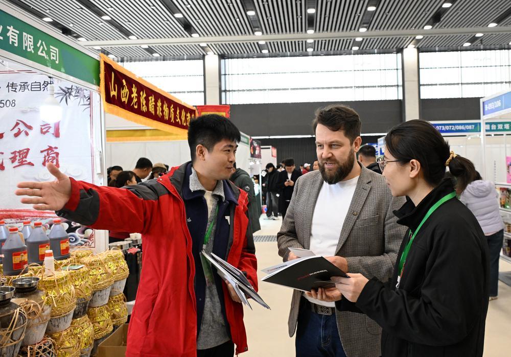 (중국 칭다오=신화통신) 19일 '2025 상하이협력기구(SCO) 국제 현대농업 및 요식업 박람회'를 찾은 해외 바이어가 상담 받고 있다. '2025 SCO 국제 현대농업 및 요식업 박람회'가 19일 산둥(山東)성 칭다오(青島)에서 개막했다. 현장에는 현대 농업 장비, 친환경 농산물, 고품질 묘종, 식재료 등이 전시됐다. 박람회와 함께 국제 바이어 매칭회 등 행사도 진행될 예정이다. 2025.12.19