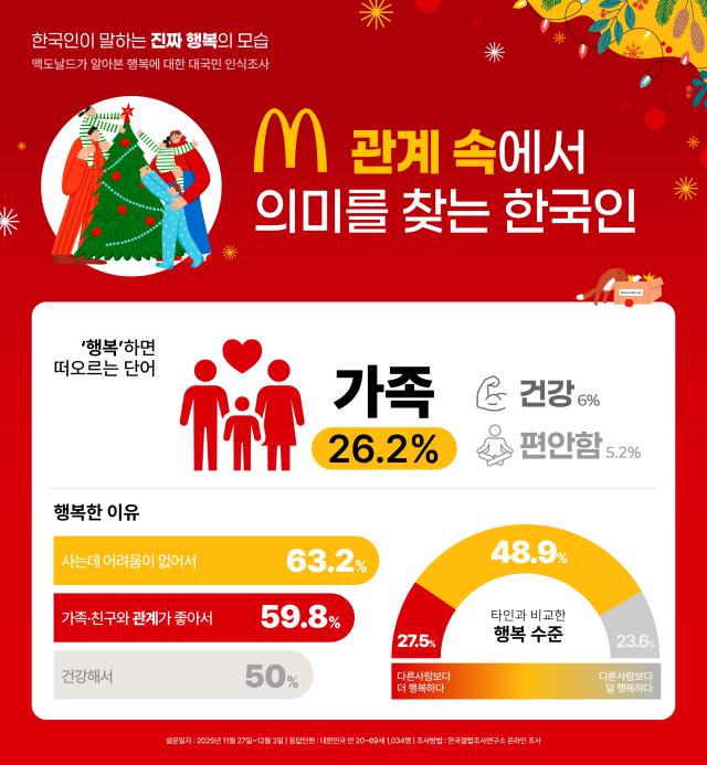 한국맥도날드 관계자는 “이번 조사를 통해 한국인에게 행복은 거창한 성취보다 일상의 경험과 주변 사람들과의 관계에서 비롯된다는 점을 확인했다”며 “앞으로도 고객의 일상 가까이에서 감사와 나눔의 가치를 실천하며 지역사회와 연결되는 사회공헌 활동을 지속해 나가겠다”고 말했다.